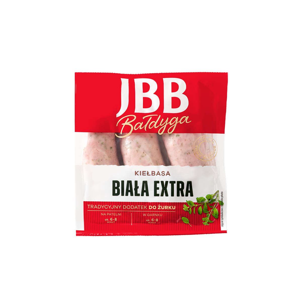 Die Biała Extra von JBB ist eine besonders zarte, mild gewürzte polnische Weißwurst, traditionell hergestellt und ideal für Frühstück, Mittagstisch oder Feiertagsgerichte.