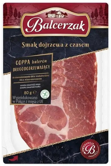 Der Baleron Długodojrzewający Coppa von Balcerzak ist ein traditioneller polnischer Blasenschinken, der durch seine lange Reifung einen intensiven Geschmack und eine zarte Textur erhält. Hergestellt aus hochwertigem Schweinefleisch, ist dieser Coppa perfekt für Aufschnittplatten, Sandwiches oder als Snack zwischendurch.
