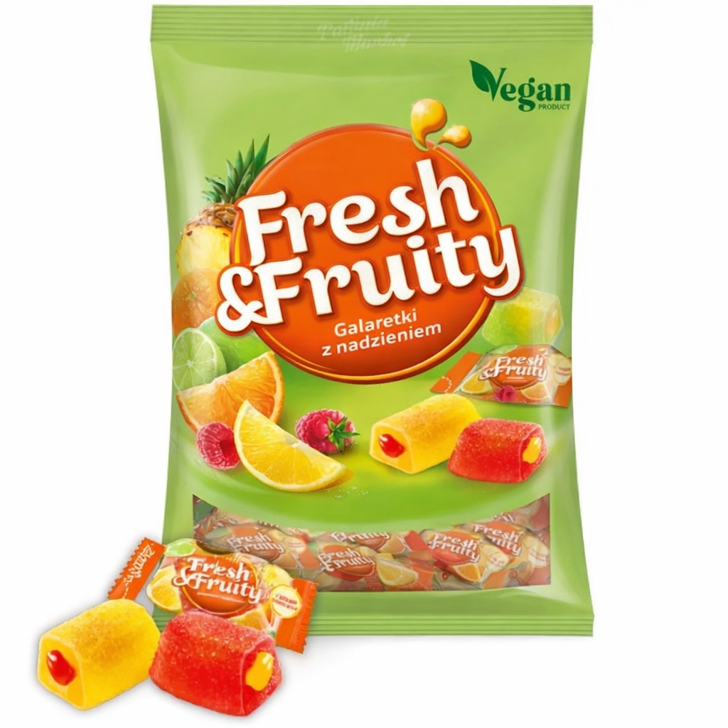 Odkryj pyszne Galaretki Fresh&Fruity od Wawelu! Te owocowe galaretki łączą naturalne aromaty owoców z delikatną, miękką konsystencją. Wykonane z prawdziwych soków ananasowych, cytrynowych, pomarańczowych i malinowych, te galaretki oferują orzeźwiające doznania smakowe. Kolorowe cukierki idealnie nadają się na przekąskę, imprezę lub jako słodka przekąska. Wawel od ponad 100 lat reprezentuje najwyższą jakość i tradycyjne polskie rzemiosło cukiernicze z Krakowa.