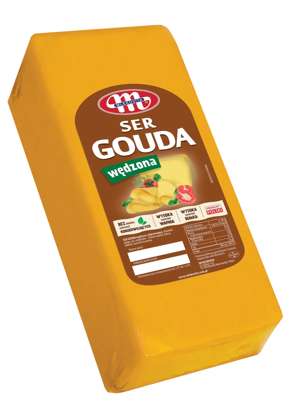 Ser Gouda Wędzona Mlekovity to dojrzały ser holenderski o łagodnym smaku i delikatnym, wędzonym aromacie. Jest skoncentrowanym i doskonałym źródłem niezbędnych minerałów. Bogate źródło wapnia, który przyczynia się do prawidłowego metabolizmu energetycznego, oraz białka, które pomaga w utrzymaniu zdrowych kości i masy mięśniowej. Nie zawiera konserwantów. Nadaje się do diet bezglutenowych i wegetariańskich.