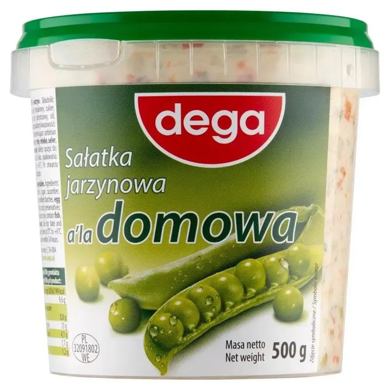 Dega to renomowany polski producent tradycyjnych sałatek i dań gotowych. Sałatka Jarzynowa Domowa przygotowywana jest według tradycyjnej receptury, z 73% świeżych warzyw: ziemniaków, marchewki, 11% groszku i ogórków. Doprawiona jest kremowym sosem majonezowym z olejem rzepakowym, przyprawami i odrobiną octu. Wygodne opakowanie 500 g wystarcza na 3-4 porcje. Produkt należy przechowywać w lodówce, aby zachował świeżość. Po otwarciu spożyć w ciągu 24 godzin.