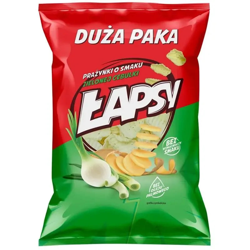 Chrupiące polskie chipsy ziemniaczane TBM Prażynki Lapsy o smaku cebuli i aromacie cebuli. Wyprodukowane z wysokiej jakości ziemniaków, doprawione suszoną cebulą, czosnkiem i pietruszką. Idealna przekąska na spotkania towarzyskie, imprezy i po prostu na każdą okazję!