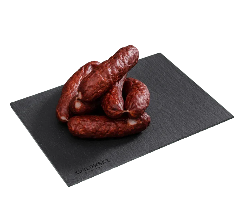 Kiełbasa Czosnkowa z Zakładów Mięsnych Kozłowski to aromatyczna, lekko podsuszona i wędzona kiełbasa wieprzowa o intensywnym smaku czosnku. Wytwarzana jest z wysokiej jakości mięsa wieprzowego, delikatnie przyprawiana i delikatnie wędzona. Idealna jako nadzienie do kanapek, przekąska lub składnik tradycyjnych dań kuchni polskiej.