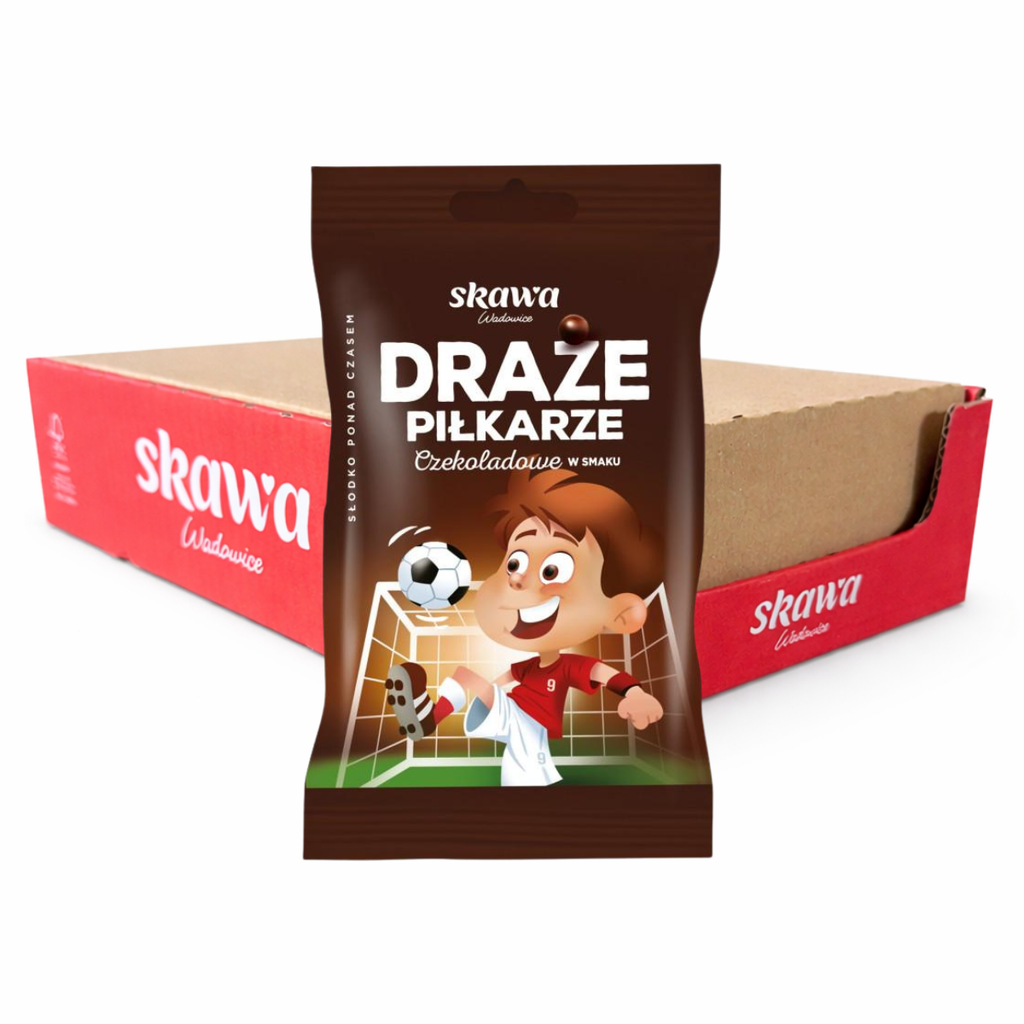 Odkryj pyszne czekoladowe drażetki Piłkarze od Skawy w wygodnym pudełku! Te pyszne drażetki o smaku czekolady są pokryte polewą kakaową o zawartości 17%, oferując niezrównane doznania smakowe. Idealne jako przekąska lub do dzielenia się z przyjaciółmi i rodziną.