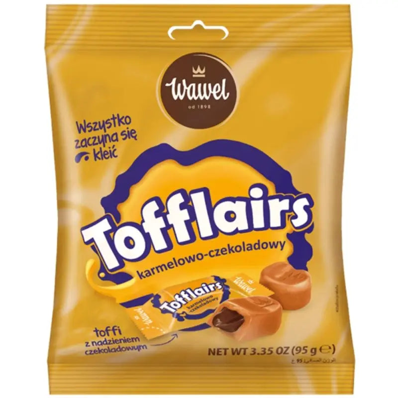 Oryginalne połączenie legendarnego smaku karmelu z gładkim, czekoladowym nadzieniem. Słodka dawka dobrego humoru, która pozostawi Cię w lepkiej konsystencji! Tofflairs łączą kremowy karmel z rozpływającą się w ustach czekoladą, tworząc nieodpartą ucztę. Idealne na przekąskę, do dzielenia się z przyjaciółmi lub jako mała nagroda w życiu codziennym.