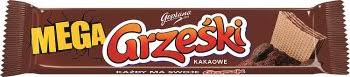Mega Wafel przekładany kremem kakaowym to popularny polski deser. Chrupiący wafel z 70% kremowym nadzieniem kakaowym to idealna mała przyjemność. Idealny jako słodka przekąska o każdej porze – pyszny i kremowy, do kawy lub herbaty – klasyczne połączenie, w podróży – poręczny rozmiar, jako mała przyjemność – Grześki, lub jako zastrzyk energii – 178 kcal w porcji. Z 12 g białka na 100 g (4,2 g w porcji) jest dobrym źródłem białka. Opakowanie zawiera 1 porcję (34 g) – idealna porcja! Każdy ma swoje Grześki – każdy ma swoje małe przyjemności! Klasyka polskich słodyczy!