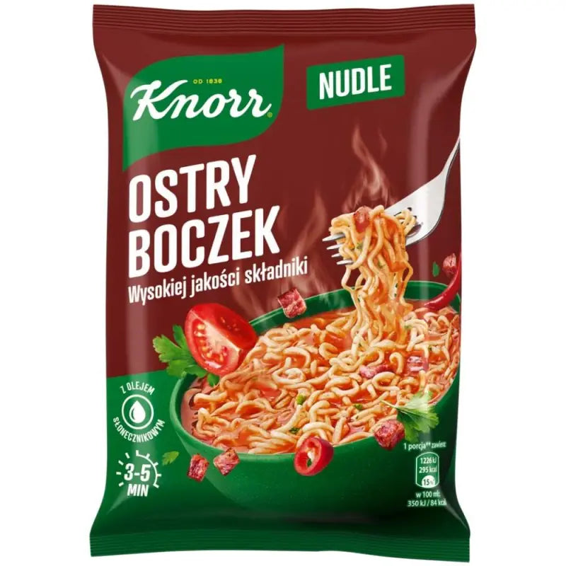 Knorr von Unilever Polska Sp. z o.o. aus Warschau ist eine weltweit bekannte Marke für hochwertige Instant-Produkte. Diese Nudle (Nudeln) Ostry Boczek (scharfer Speck) sind herzhafte Instant-Nudeln mit dem Geschmack von geräuchertem Speck und scharfen Gewürzen. Mit 83% Nudeln (Weizenmehl, Palmfett, Salz, modifizierte Stärke, Zucker, Rapsöl) und 17% Gewürzmischung (Tomatenkonzentrat 17%, Pfeffer 13,8%, geräucherter Speck 2,6%, Cayennepfeffer, Knoblauch) – für authentischen, scharfen Geschmack. In nur 5 Minuten fertig!