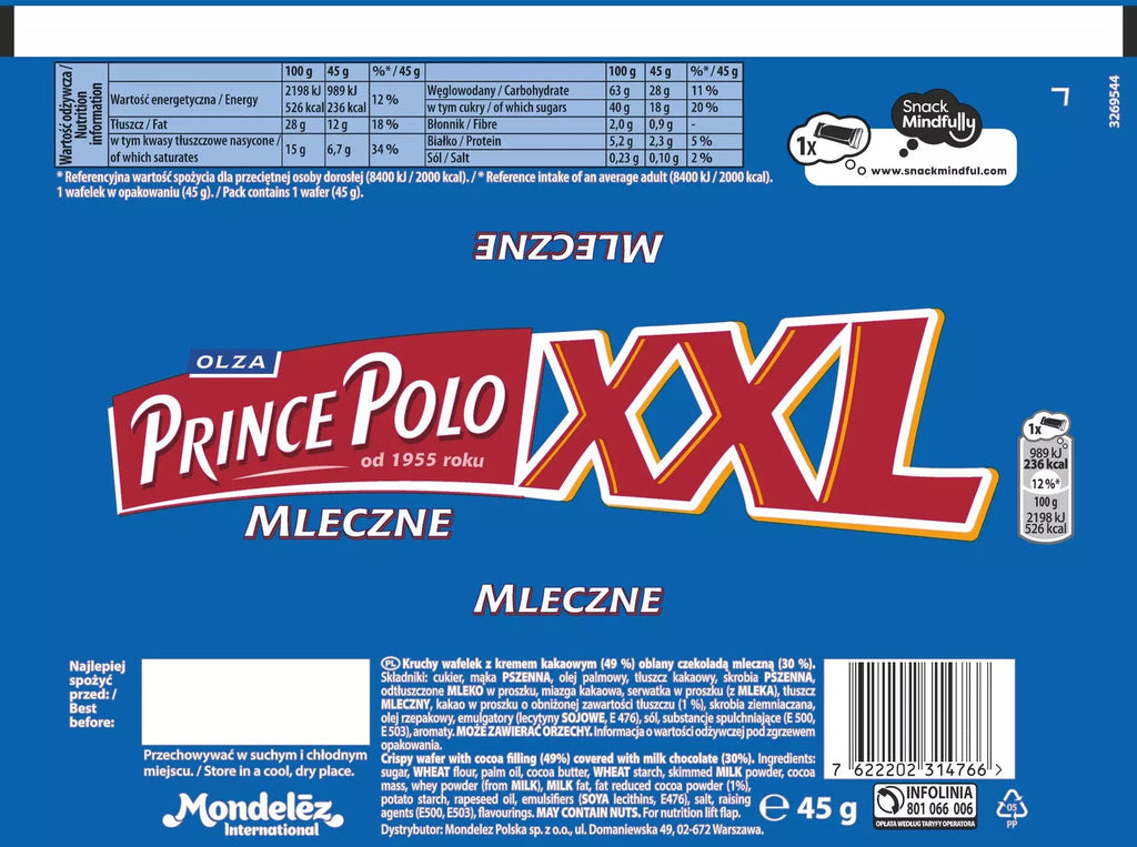 Der köstliche Prince Polo XXL mit Milchschokoladengeschmack vereint knusprige Waffelschichten mit cremiger Milchschokoladenfüllung. Jeder Riegel (50 g) bietet intensiven Schoko-Genuss – und im Vorteilspack mit 28 Stück erhältst du 1,4 kg vollmundigen Polnischen Waffelriegel-Spaß. Ideal als Snack für zwischendurch, zum Teilen oder als süßes Highlight im Sortiment.