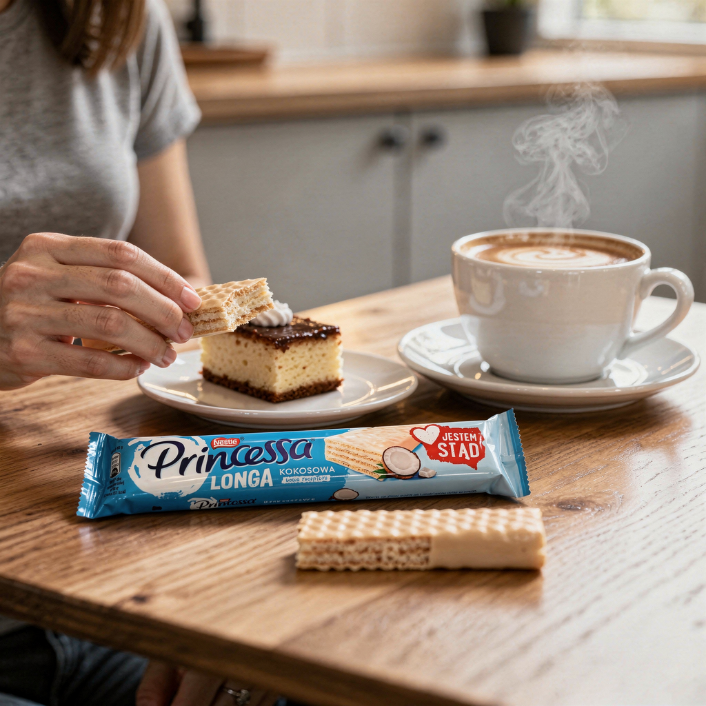 Eine zarte und knusprige Waffel, überzogen mit flauschiger Kokoscreme und bedeckt mit weißer Schokolade, die einfach im Mund zergeht. Der Princessa Longa Kokos-Waffelriegel ist der perfekte Snack für zwischendurch und erinnert an den unverwechselbaren Geschmack polnischer Süßwaren.